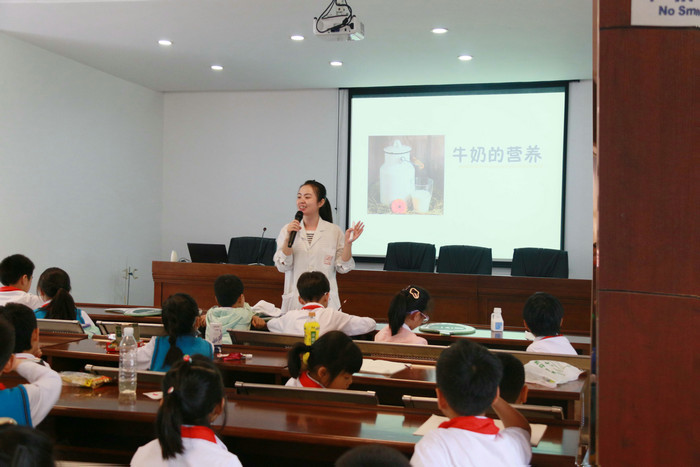 在三樓多功能廳,講解員帶領同學們了解了煉乳發展歷史淵源,百強乳業企業文化、管理模式;介紹了牛奶和煉乳產品品類;剖析了乳制品之間的乳蛋白含量差異;科普了飲用牛奶的諸多益處及應該注意的食品安全問題, 并現場演示煉乳檢測酸度的小實驗。